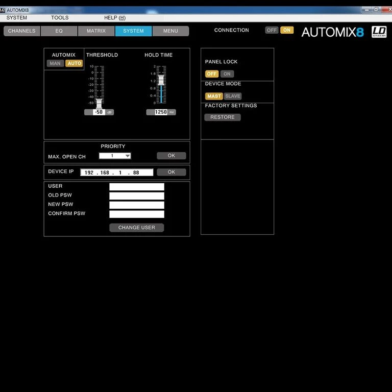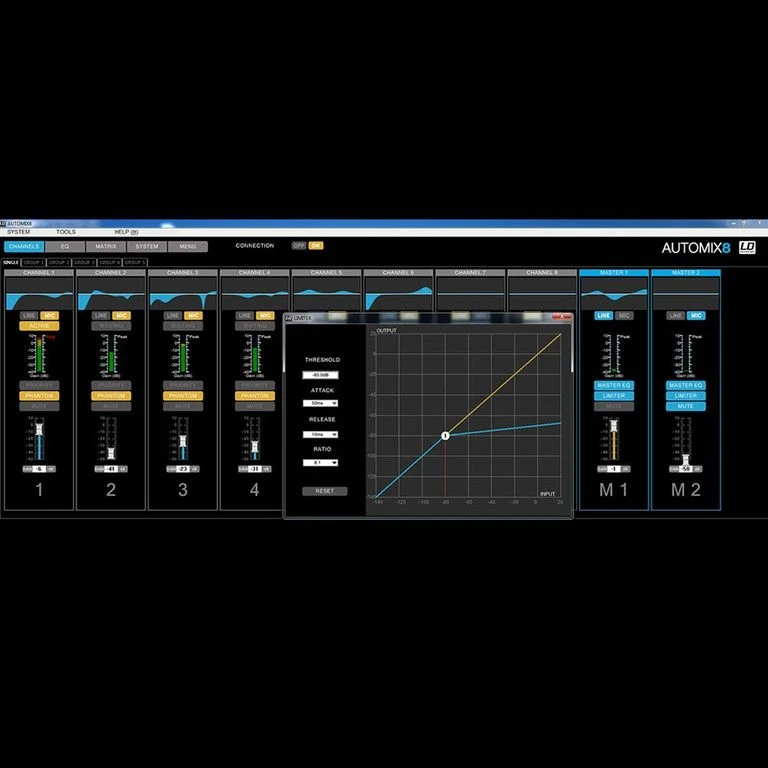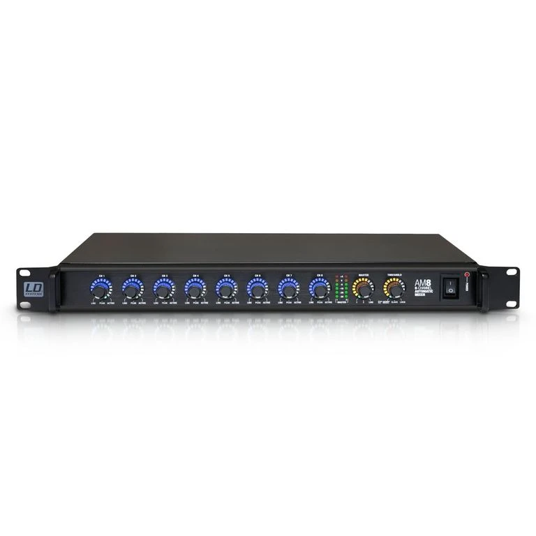| Модель | AM 8 | | Входной блок | | Общее количество входных каналов | 8 (Mic / Line переключаемые) | | Разъемы входных каналов | Задняя панель: 8 х 3-pin клеммный блок | | Чувствительность микрофонных входов | 8,7 / 800 мВ | | Импеданс микрофонных входов | 2 кОм | | Чувствительность линейных входов | -1 dBu | | Импеданс линейных входов | 8,4 кОм | | Фантомное питание | 48 В | | Индикация | ACTIVE (функция приоритета, зеленый светодиод), уровень усиления (синее светодиодное кольцо, 16 сегментов), LINE (зеленый светодиод), PEAK (красный светодиод) | | Выходной блок | | Общее количество выходных каналов | 2 | | Разъемы выходных каналов | 2 х 3-контактный клеммный блок(аналоговый), AES / EBU (цифровой) | | Элементы управления выходными каналами (MASTER) | Регулировка входного сигнала (дискретная, 24 шага), Gain (с шагом 1 дБ), переключатель Master 1 или 2, выходной уровень MIC / LINE | | Элементы управления выходными каналами (TRESHOLD) | Авто / Ручной (ручной: настраиваемый пороговый уровень), Блокировка (блокировка органов управления на передней панели), Master/Slave (для функции LINK) | | Выходной уровень mic/line | 20 dBu | | Выходной импеданс | 100 Ом | | Индикация выходного блока (MASTER) | LINE (зеленый светодиод), Master 1/2 (2 x зеленый светодиод), Master Level (оранжевое светодиодное кольцо, 16 сегментов) | | Индикация выходного блока (TRESHOLD) | AUTOMIX / MANUAL (зеленый / красный светодиод), LOCK (заблокированный пользовательский интерфейс: красный светодиод), MASTER / SLAVE (Master: зеленый светодиод) | | Элементы управления на задней панели | Reset (сброс) | | DSP | | Функции DSP | Матрица 8 x 2, Автомикс, Динамическая обработка (компрессор / лимитер), Эквалайзер, Уровни | | Разрядность АЦП/ЦАП / Частота дискретизации | 24 бит / 94 кГц | | Программное обеспечение | | Управление входными каналами | Эквалайзер, уровень, MIC/LINE (переключаемый), MUTE, фантомное питание, приоритет | | Фильтр высоких частот | 35 – 150 Гц | | Эквалайзер на входных каналах | ByPass, частота 20 Гц - 20 кГц, регулируемая с шагом 1 Гц, параметрический 5-полосный или полочный эквалайзер (+/- 15 дБ), сброс, регулируемая добротность (Q) (0,3 - 20) | | Диапазон регулировки Gain | 65 дБ | | Аттенюация в режиме Mute | 90 дБ | | Управление выходными каналами | Уровень, лимитер, мастер эквалайзер, mute | | Эквалайзер на выходных каналах | ByPass, частота 20 Гц – 19,8 кГц, регулируемая с шагом 1 Гц, параметрический 15-полосный или полочный эквалайзер (+/- 15 дБ), сброс, регулируемая добротность (Q) (0,3 - 20) | | Динамическая обработка на выходных каналах | Время срабатывания (10 мс – 2 с), отношение (компрессор 1:1 – 10:1, лимитер), время восстановления (10 мс – 2 с), сброс, порог стабатывания (-80 дБ – +20 дБ) | | Максимальное количество открытых каналов | 8 | | Automix - максимальное время удержания | 2 с | | Внешнее управление | Внешнее управление RS-232 (Уровни, Mute), программное обеспечение TCP / IP Ethernet для ПК (полное управление) | | Спецификация | | Количество зон | 2 | | Максимальное количество подключенных устройств | 16 | | Высота | 19" / 1 U | | Другие разъемы | Внешнее управление (25-pin D-sub), Link In / Link Out (MiniDIN4-M), сеть (RJ45), RS-232 (9-pin D-sub) | | Дополнительные элементы индикации | Индикатор питания | | Частотный диапазон | 20 Гц – 30 кГц | | Отношение сигнал/шум | 85 дБ | | Уровень шума | -120 дБ | | Перекрестные помехи | 87 дБ | | Коэффициент нелинейных искажений (THD) | 0,02% | | Время запуска | 8 с | | Энергопотребление | 14 – 30 Вт | | Напряжение питания | 110 – 240 В / 50 – 60 Гц | | Габариты (ШхВхГ) | 481 х 44 х 232 мм | | Вес | 2,58 кг | | Аксессуары в комплекте | 11 x винтовой клеммный блок, кабель MiniDIN4-M-link, про