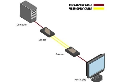 Комплект устройств для передачи сигнала DisplayPort 1080p/120 (2560x1600) с DP++, HDCP и DPCP по многомодовому оптоволоконному кабелю (2хLC), расстояние: 300 м – OM2/OM3, 150 м – OM1.