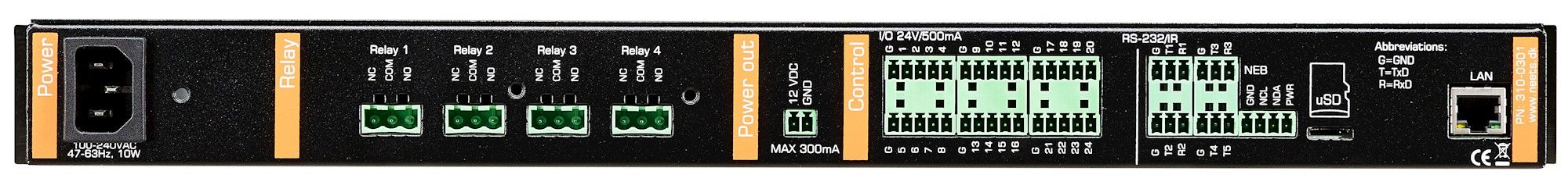 Контроллер рэковый. Черный цвет корпуса. Порты: 3 x RS-232(TX и RX) либо 4 х ИК; 2 x RS-232 (TX) либо 4 x ИК; 1 x LAN; 24 x I/O; 4 х Relay; 1 x NEB.