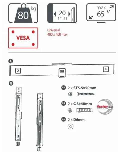 Кронштейн WM6421 - это наклонный кронштейн для ТВ размера от 32 дюймов до 60 дюймов, с максимальной нагрузкой до 80 кг и максимальным размером VESA 400, принадлежащий серии ULTRA SLIM.