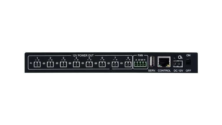 12 В распределитель питания на 8 устройств (терминальные блоки 2-pin), подключение двух вентиляторов 12 В, 115 Вт в сумме, входное питание 12 В, 12.5 А. Для системы группового монтажа в стойку. Управление по RS-232 и IP (web-интерфейс и Telnet).