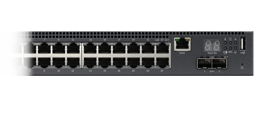 24-портовый управляемый коммутатор, RJ45 10/100/1000 Мб. Расширяется в стэк до 12-ти коммутаторов.