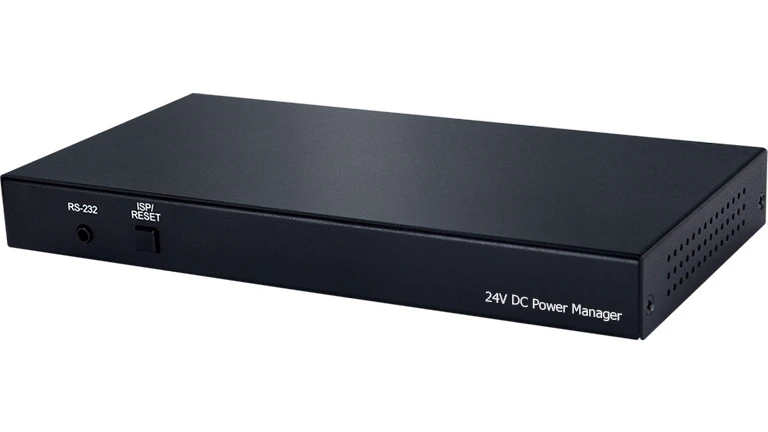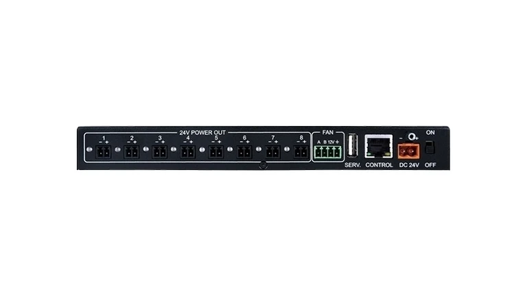 24 В распределитель питания на 8 устройств (терминальные блоки 2-pin) и подключение двух вентиляторов 12 В, 115 Вт в сумме, входное питание 24 В 6.25 А, для системы группового монтажа в стойку. Управление по RS-232 и IP (web-интерфейс и Telnet).