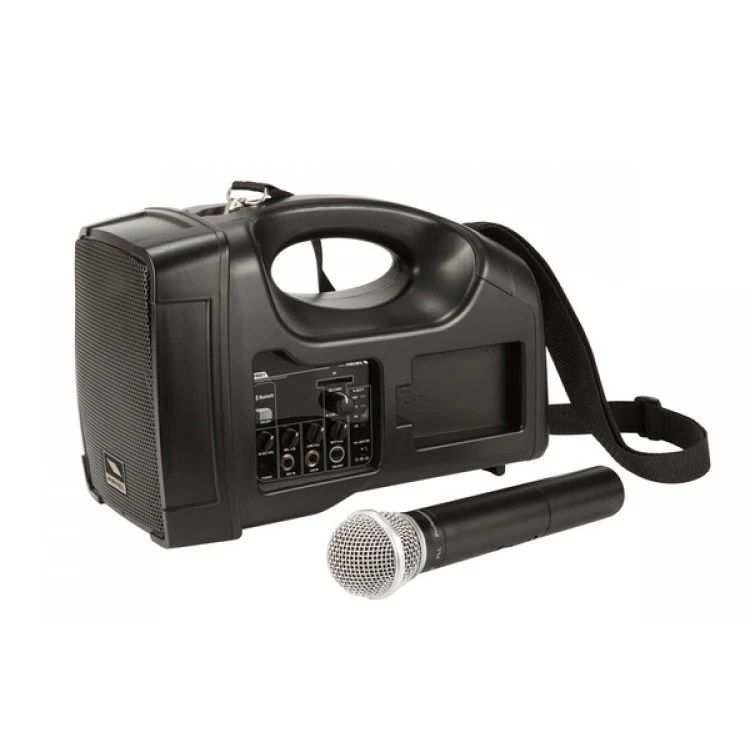 3'' двухполосная портативная система звукоусиления 35 Вт – 70 В с усилителем и радиомикрофоном, 150 Гц – 20 кГц (±3 дБ). Bluetooth, чтения карт USB / SD. Автономность 3 часа. Сумка в комплекте.