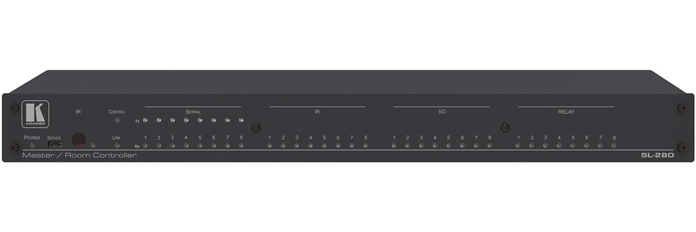 32-портовый главный контроллер помещения, 8 RS-232, 1 вход (для обучения) / 8 выходов ИК, 8 GPIO, 8 реле, Ethernet. Работает с ПО Kramer Control.