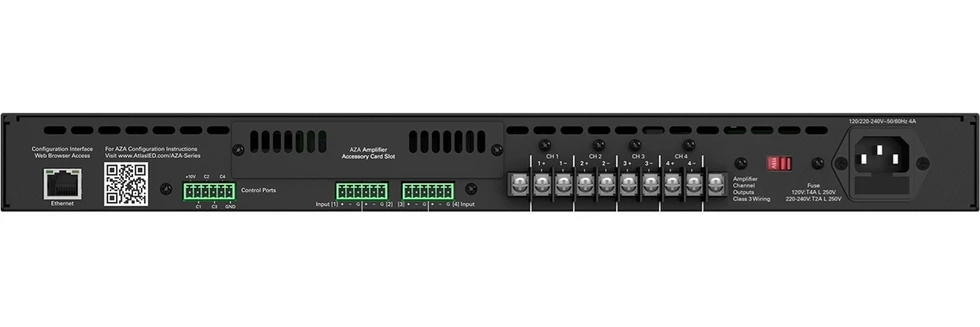 4-канальный усилитель мощности серии ATMOSPHERE 4х100 Вт / 4 Ом, 4х150 Вт / 8 Ом, 4х200 Вт / 70/100 В. Управление по IP (web-интерфейс).