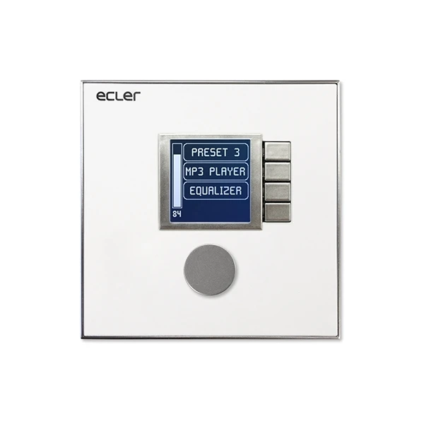 4-кнопочный настенный контроллер, регулировка громкости, выбор источника, предустановки и 3-полосный эквалайзер, LCD-экран, для EclerNet. ПО EclerNet Manager.