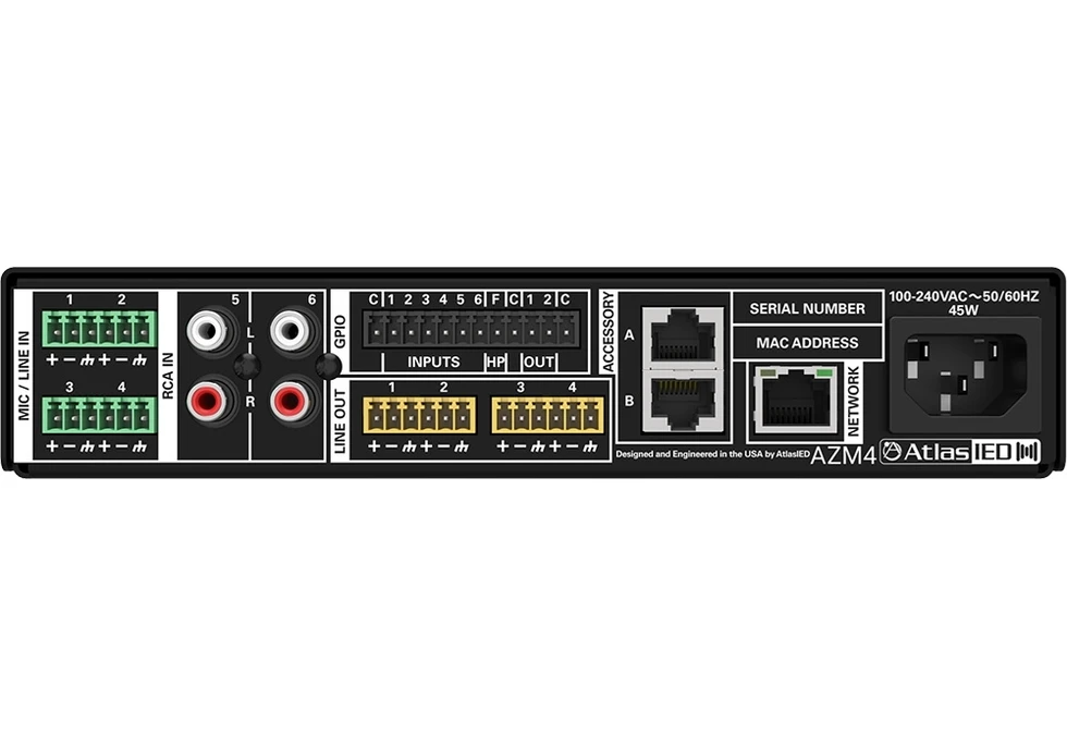 4-зонный DSP-аудиопроцессор серии ATMOSPHERE для систем озвучивания со встроенным проигрывателем сообщений. Входы: 4 Mic/Line, 2 стерео RCA, GPI/O (6 входов, 2 выхода), балансные выходы. Управление по IP (web-интерфейс), Wi-Fi.
