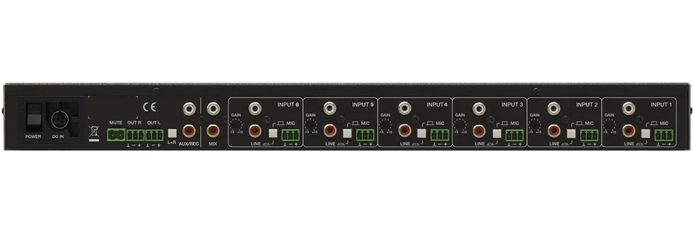 6-канальный коммутатор/микшер, входы: 6 Mic/Line (питание 18 В), 1 MIX. Вых.: стерео бал. Приоритет входа 1.
