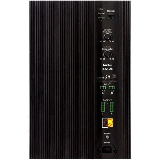 Активный сабвуфер 8'', 100 Вт/8 Ом + два канала для подключения сателлитов 2х100 Вт/8 Ом + 1xRJ45 (для регулятора громкости VC3008 и VC4008). Чувств. 95 дБ. Габаритные размеры: 250x420x715 мм. Цвет черный.
