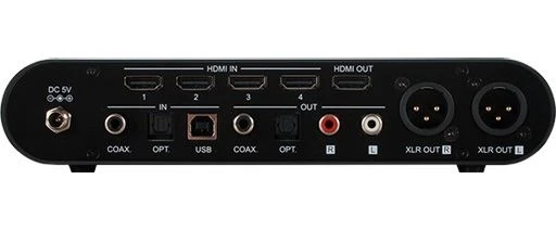 A/V-центр, коммутатор 4х1 сигналов HDMI 4096x2160/60 с поддержкой цветового пространства 4:4:4, полоса пропускания 600 МГц, и цифрового аудио S/PDIF (TOSLINK, RCA, USB) с частотой до 384 кГц, эмбеддер/деэмбеддер аудио, выходы: S/PDIF (TOSLINK, RCA), балансное (2xXLR), небалансное (2xRCA) аудио.