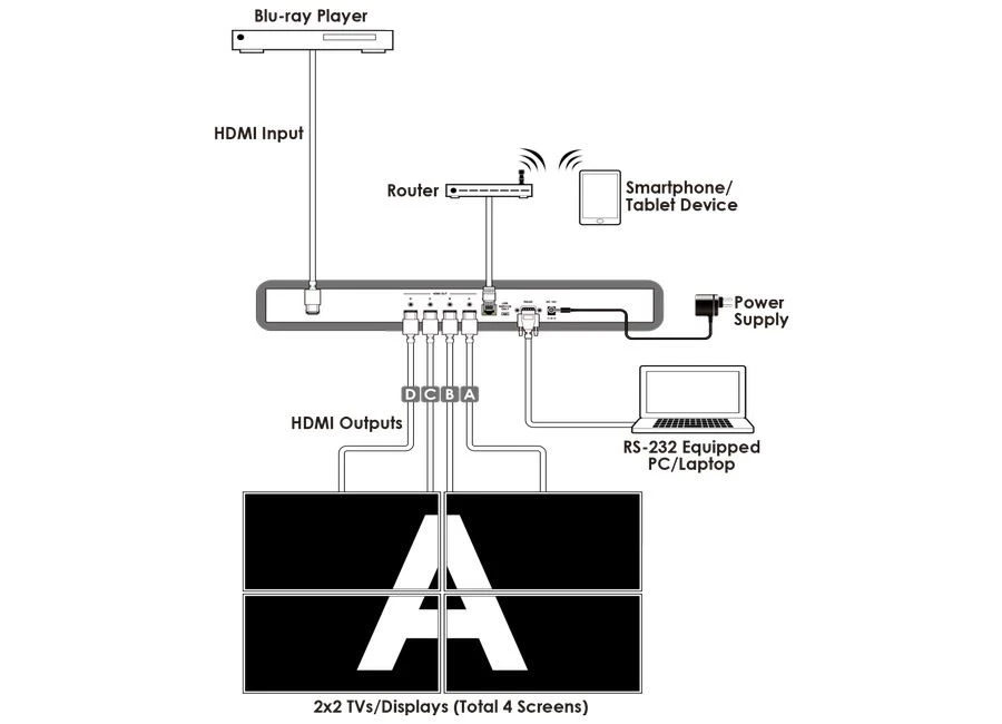Бесподрывный контроллер видеостены (1х4, 2х2, 4х1 до 15х15), распределитель 1:4 сигнала HDMI 1080p/60 (1920х1200, 3D) с HDCP, коррекция рамок, управление по RS-232 и IP, каскадирование для больших видеостен, дополнительное ПО для настройки видеостены.