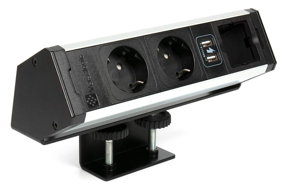 Блок розеток с актуальным наполнением удобен для оснащения любого рабочего места. Монтируется на край столешницы толщиной от 15 до 40мм с помощью струбцыны. При необходимости блок легко переставляется. Резервное (пустое) гнездо можно использовать для встройки слаботочных модулей Keystone, установить рамку для вывода проводов или закрыть заглушкой. Модуль комплектуется проводом 10см с разъемом GST18