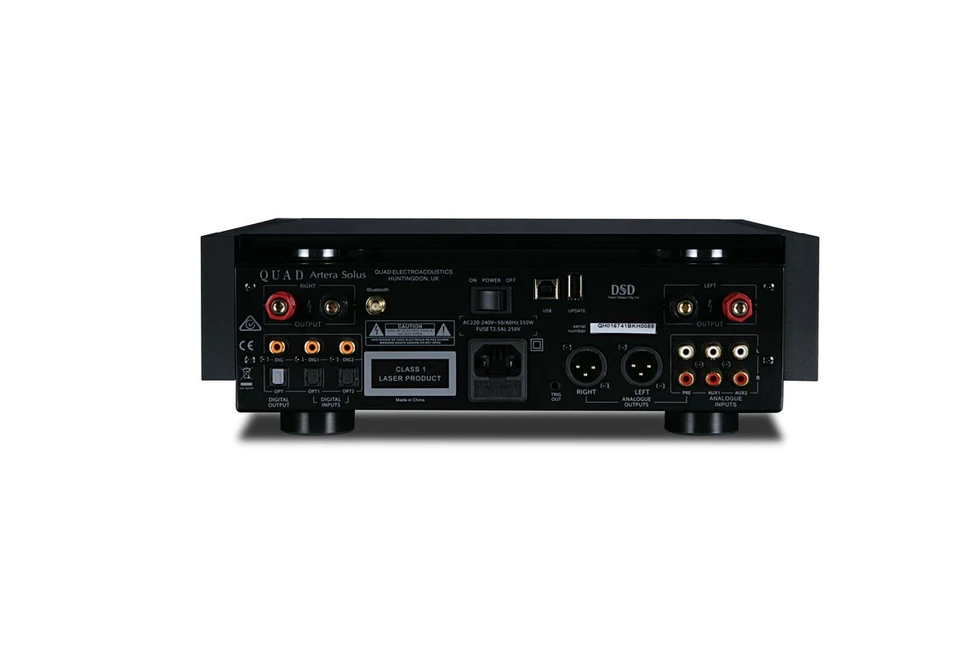 CD проигрыватель Quad Artera Solus со встроенным ЦАП ESS ES9018 32бит/384 кГц и усилителем мощности. Bluetooth. Мощность: 2x75Вт. Входы: 1x toslink, 2xRCA (цифровые), 2хRCA (аналоговые), USB. Выходы: 1xToslink, 1xRCA(цифровой), 2xXLR (аналог), 2xRCA (аналог). Цвет: Серебро [Silver]