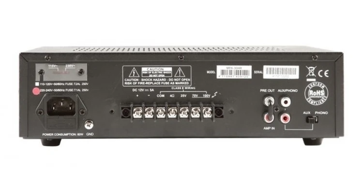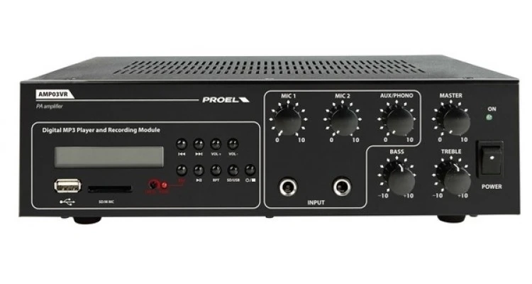 Четырехканальный микшер и усилитель мощности 30 Вт – 4 Ом, 25/70/100 В со встроенным рекордером.