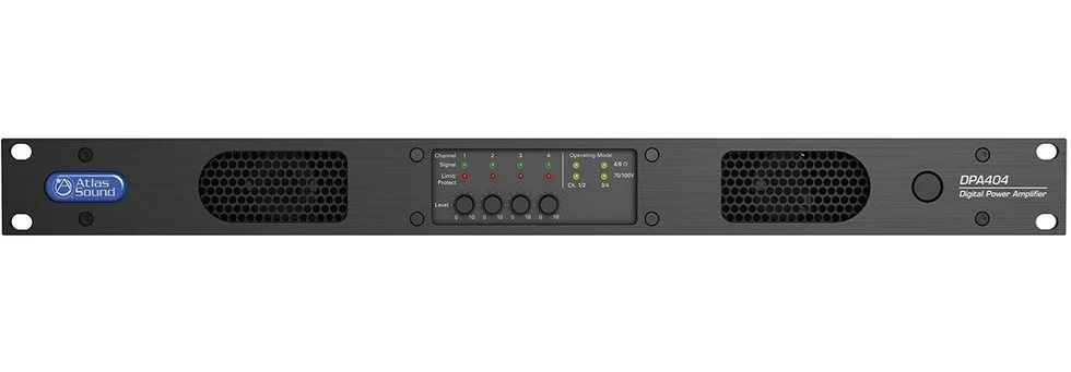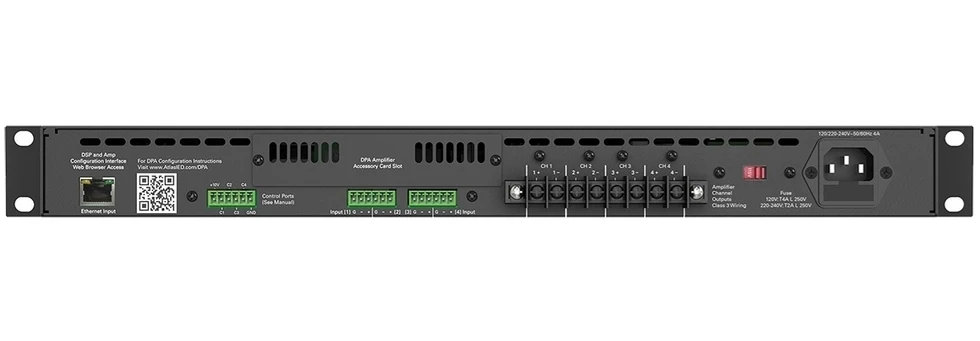 Четырехканальный усилитель мощности с DSP-процессором. 4x50 Вт – 4 Ом, 4x75 Вт – 8 Ом, 4х100 Вт – 70/100 В. Балансные входы, веб-интерфейс. Высота 1U.