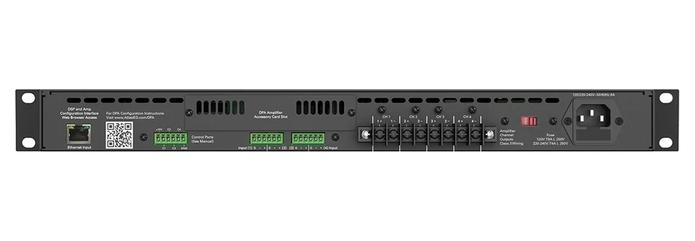 Четырехканальный усилитель мощности с DSP-процессором. 4x100 Вт – 4 Ом, 4x150 Вт – 8 Ом, 4х200 Вт – 70/100 В. Балансные входы, веб-интерфейс. Высота 1U.
