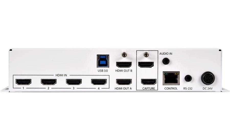 Четырехоконный мультивьювер HDMI 4K/60 (YUV 4:4:4), бесподрывный матричный коммутатор 4х2, устройство захвата потока HDMI через USB 3.0. Полоса 600 МГц. Управление по IP (web-интерфейс, Telnet), RS-232.