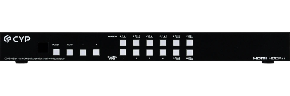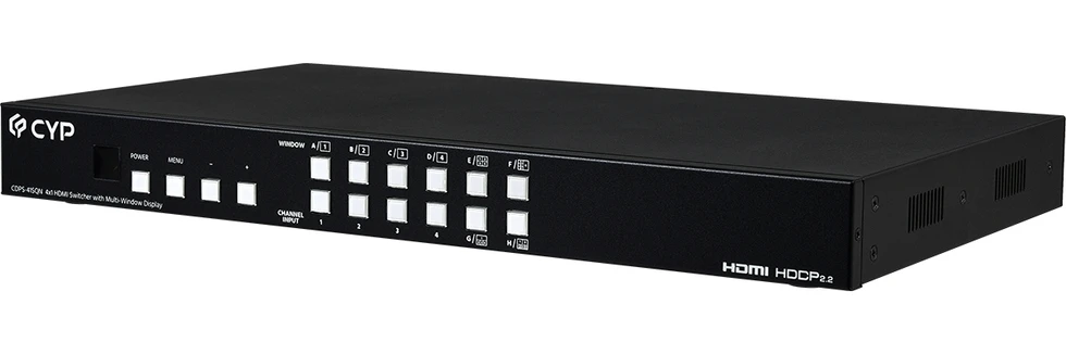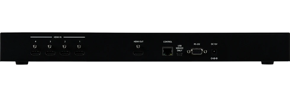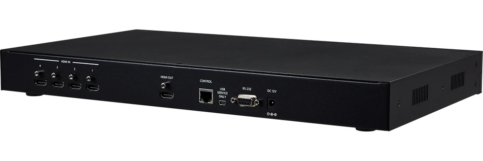 Четырехоконный мультивьювер сигналов HDMI 1080p/60 (1920х1200/60), выход HDMI 1080p/60 c PiP и PoP, хромакей, «зеркало», поворот 90°, 180°, логотип, 8 заводских конфигураций окон, управление по ИК, RS-232 и IP.