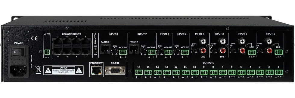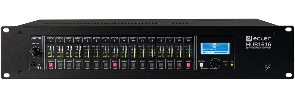Цифровая матрица аудиосигналов, DSP-аудиопроцессор серии HUB с фиксированной архитектурой, 16х16 входов/выходов. Входы: 2 стерео, 2 стерео/Line, 2 Mic/Line, 2 Mic/Line/Pager, 8 удаленных входов (RJ45) от локальных панелей WPa. Фантомное питание 48 В. Управление с панелей WPa и/или eMCONTROL1, по IP и RS-232, ПО Ecler pilot, web-интерфейс.