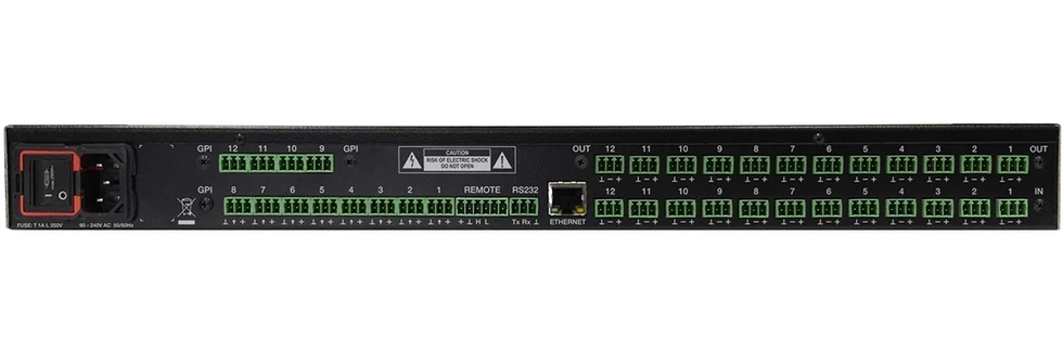 Цифровая матрица аудиосигналов, DSP-аудиопроцессор серии MIMO с фиксированной архитектурой, 12х12 входов/выходов Phoenix, 8 логических входов GPI, эхоподавление с 4 входов.
