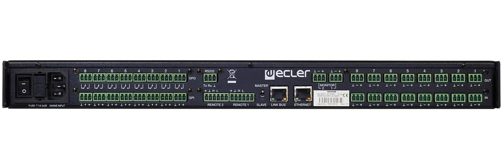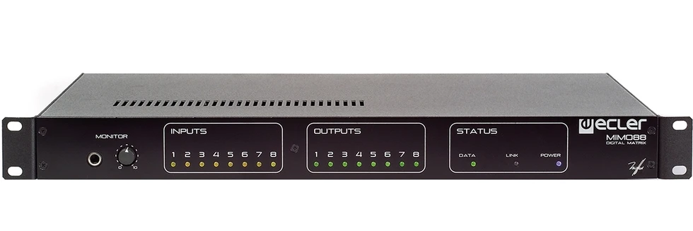 Цифровая матрица аудиосигналов, DSP-аудиопроцессор серии MIMO с фиксированной архитектурой, 8х8 входов/выходов Phoenix, 8 логических входов GPI, 8 релейных выходов GPO, 2 мониторных выхода. Объединение двух MIMO88. Управление по IP и RS-232, ПО EclerNet.