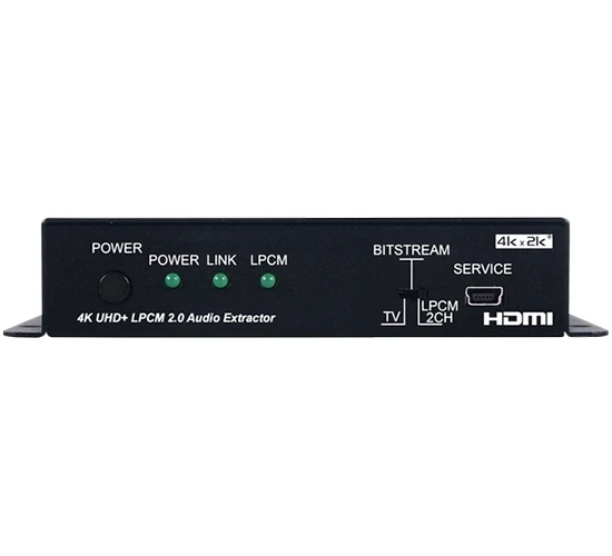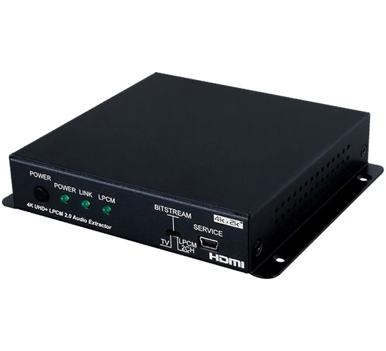 Декодер стереосигнала (2хRCA) и цифрового аудио S/PDIF (TOSLINK) из HDMI 4096x2160/60, 3D (YUV 4:4:4) c HDCP 1.4, 2.2, EDID и CEC, полоса пропускания 600 МГц. Поддерживаются форматы эмбеддированного аудио LPCM 7.1 и HD bitstream с частотой до 192 кГц, выход: 2 канала LPCM и HD bitstream. Управление по RS-232 через USB.