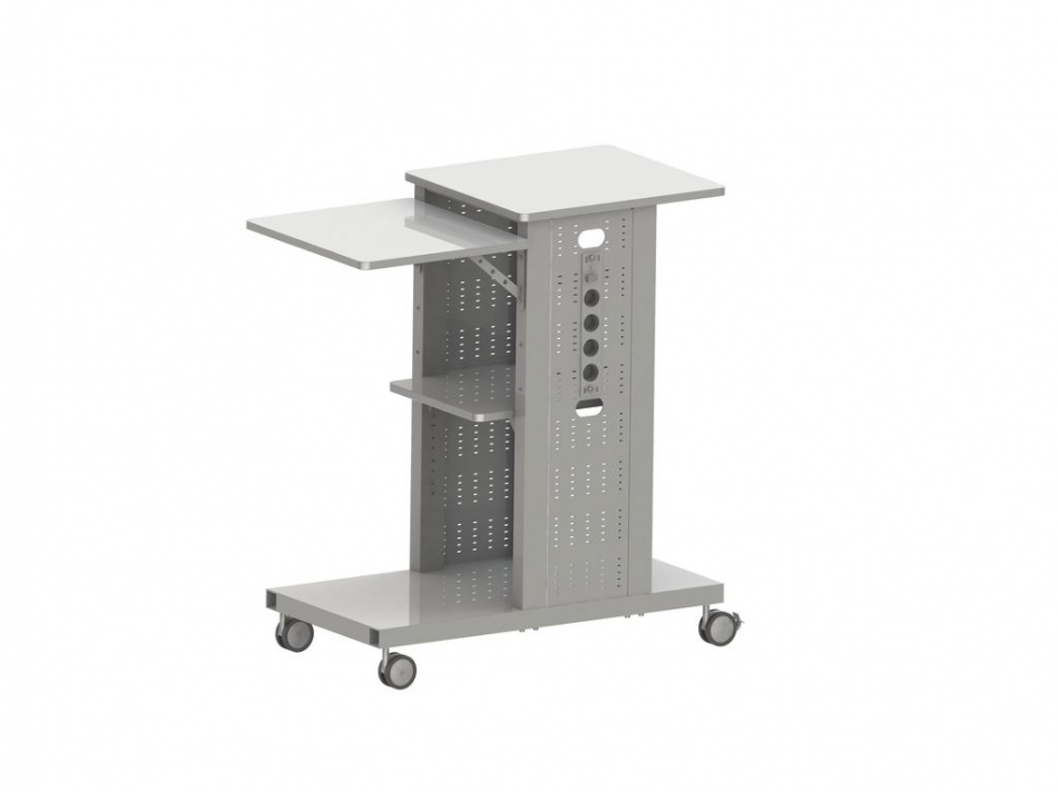 Столик удобен для размещения мультимедийного проекционного оборудования. Модель выгодно отличается не только надежностью в эксплуатации, но и строгостью дизайнерского решения. Конструкция предусматривает две столешницы, нижняя легко поворачивается вокруг оси правой стойки (угол поворота – 270 градусов).