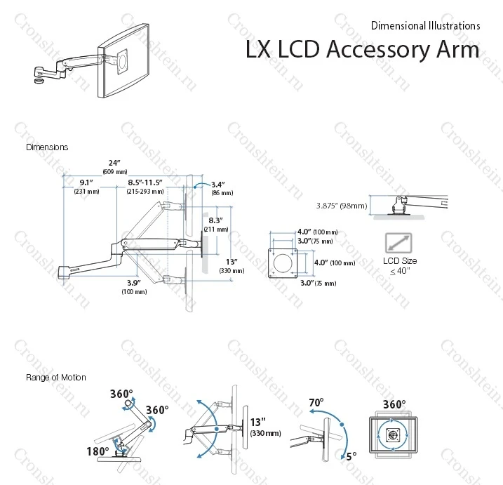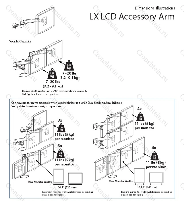 Дополнительное крепление для монитора Ergotron 98-130-216. арт 7915 - для монитора для креплений серии LX. Нугрузка 3.2-11.3 кг, регулировка по высоте 33 см, наклон 75°, поворот 360°, вращение 360°, VESA 75/100.