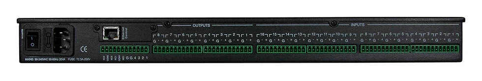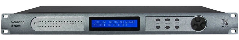DSP-аудиопроцессор (40 бит, плавающая точка) серии Neutrino с открытой архитектурой, 16х8 входов/выходов Phoenix с фантомным питанием 48 В, 8 каналов AEC, 4 логических входа, 2 релейных выхода, управление по IP.