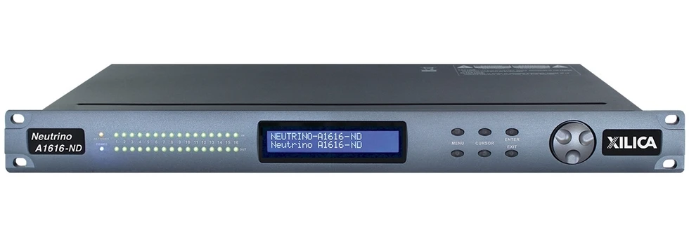 DSP-аудиопроцессор (40 бит, плавающая точка) серии Neutrino с открытой архитектурой и Dante, 16х16 аналогового аудио, 8х8 цифрового аудио AES/EBU, 4 логических входа, 2 релейных выхода, управление по IP.