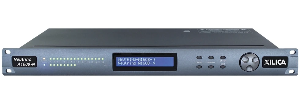 DSP-аудиопроцессор (40 бит, плавающая точка) серии Neutrino с открытой архитектурой и Dante, 16х8 входов/выходов Phoenix, 4 логических входа, 2 релейных выхода, управление по IP.