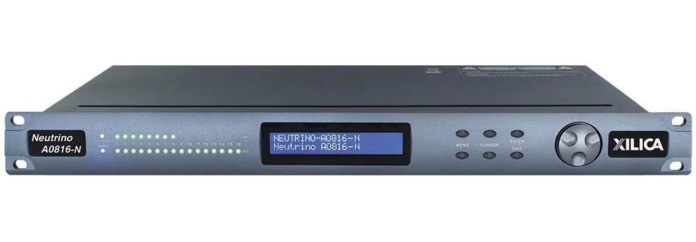 DSP-аудиопроцессор (40 бит, плавающая точка) серии Neutrino с открытой архитектурой и Dante, 8х16 входов/выходов Phoenix, 4 логических входа, 2 релейных выхода, управление по IP.