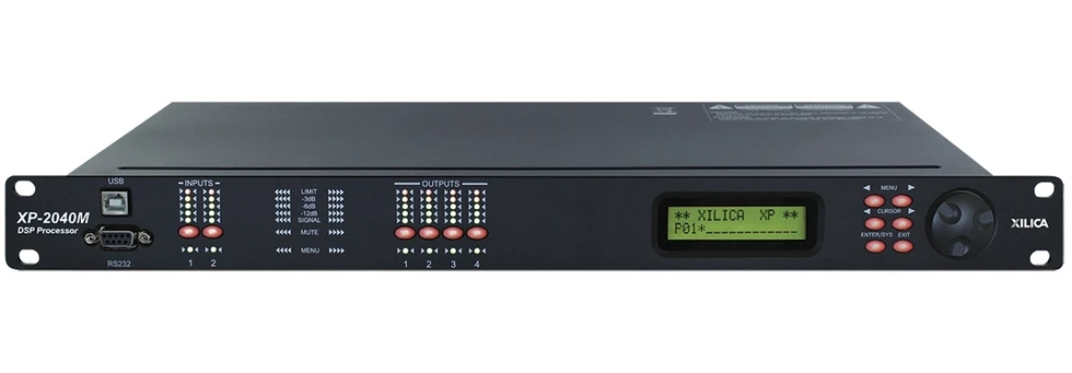 DSP-аудиопроцессор (40 бит, плавающая точка) серии XP для АС, фиксированная архитектура, IIR-фильтры, 2 линейных/микрофонных входа, 4 выхода XLR, управление по USB, RS-232 и IP.