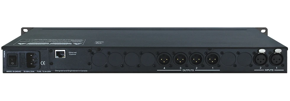 DSP-аудиопроцессор (40 бит, плавающая точка) серии XP для АС, фиксированная архитектура, IIR-фильтры, 2х4 линейных входов/выходов XLR, управление по USB, RS-232 и IP.