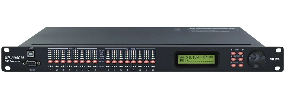 DSP-аудиопроцессор (40 бит, плавающая точка) серии XP для АС, фиксированная архитектура, IIR-фильтры, 8 линейных/микрофонных входов, 8 выходов Phoenix, управление по USB, RS-232 и IP.