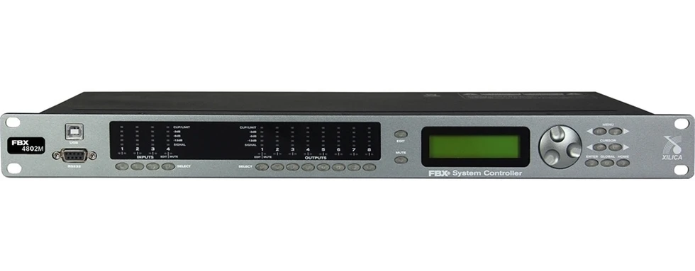 DSP-аудиопроцессор серии FBX c фиксированной архитектурой, 4 линейных/ микрофонных входа, 8 линейных выходов с подавителем обратной связи.