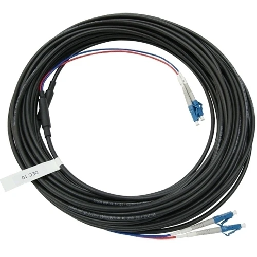 Дуплексный многомодовый оптоволоконный кабель с разъемами 2LC-2LC в защитной оболочке.