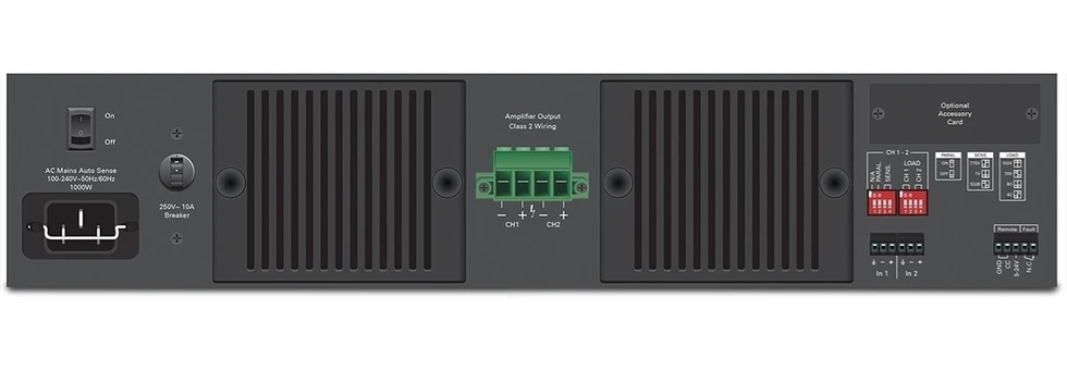 Двухканальный усилитель мощности 2х650 Вт – 70/100 В, 2х650 Вт – 8 Ом, 2х650 Вт – 4 Ом. Балансные входы. Защита, удаленное включение, опциональная карта Dante.