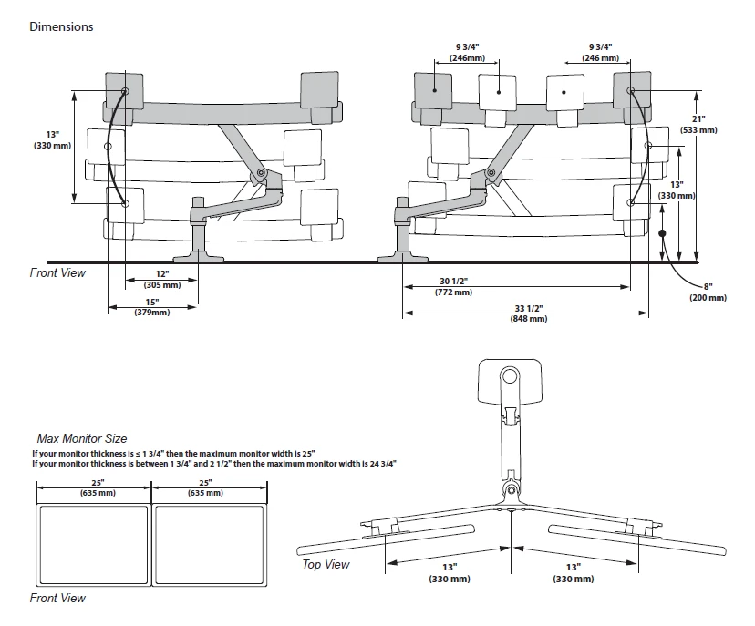 Настольный кронштейн для двух мониторов с диагональю до 27" (макс ширина монитора с рамкой 654 мм). Мониторы располагаются на одной дуге, бок-о-бок. Ручка (98?037?062) в комплект не входит. Крепление к столу - струбцина. Нагрузка 0.9-5.0 кг (для одного мо