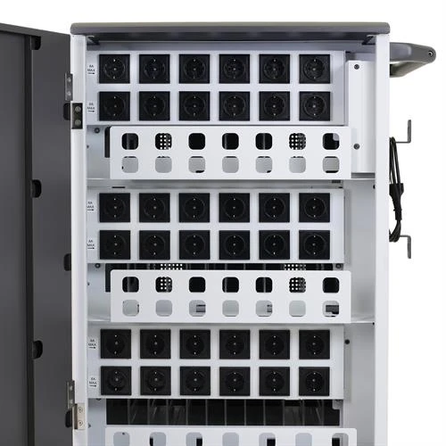 Эта зарядная тележка позволяет заряжать, хранить и транспортировать до 36 ноутбуков, хромбуков и планшетов с размерами экрана до 13", а некоторые до 14". У вас устройства больше? Просто установите ширину и высоту полки отсека тележки с помощью разделителе