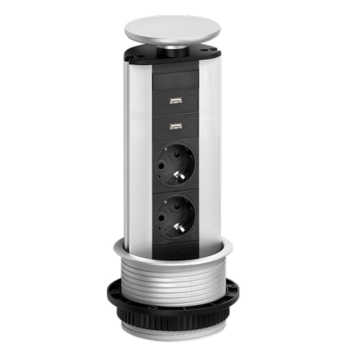 Эксклюзивное оснащение рабочего места на кухне, в кабинете, офисе, в номере гостиницы. В закрытом положении крышка оставляет пространство для пропуска кабелей. Выдвинули розетку, подключили ваши гаджеты, задвинули розетку внутрь. Готово! Удобная комплектация: 2 силовые позетки с заземляющим контактом и 2 USB-зарядки.