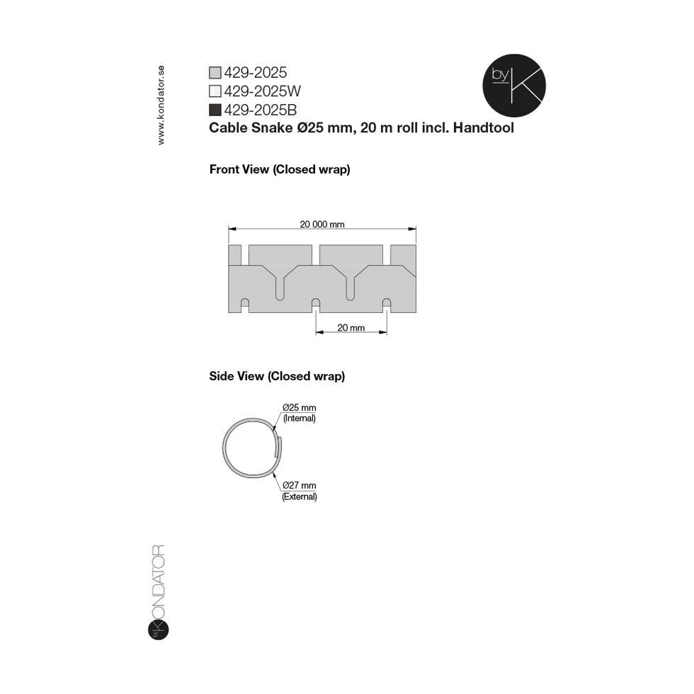 Гибкий кабель-канал Kondator 429-2025, Длина 20 м. Гибкий кабель-канал для укладки кабелей. Большая гибкость и простота установки для скрытия кабеля делает его идеальным как для офисных, так и домашних применений. Цвет: Серебристый. В комплекте инструмент для ввода кабеля. Производитель: Швеция.