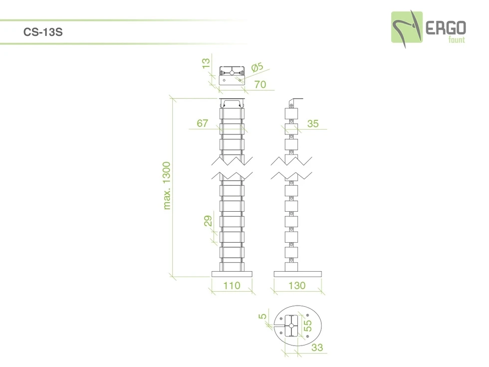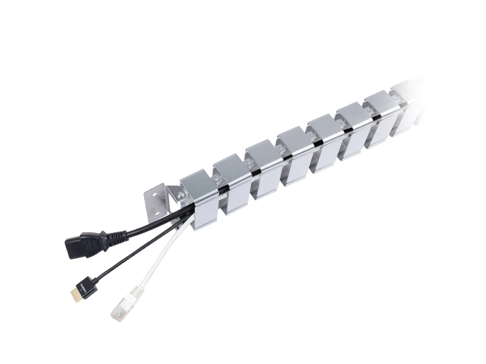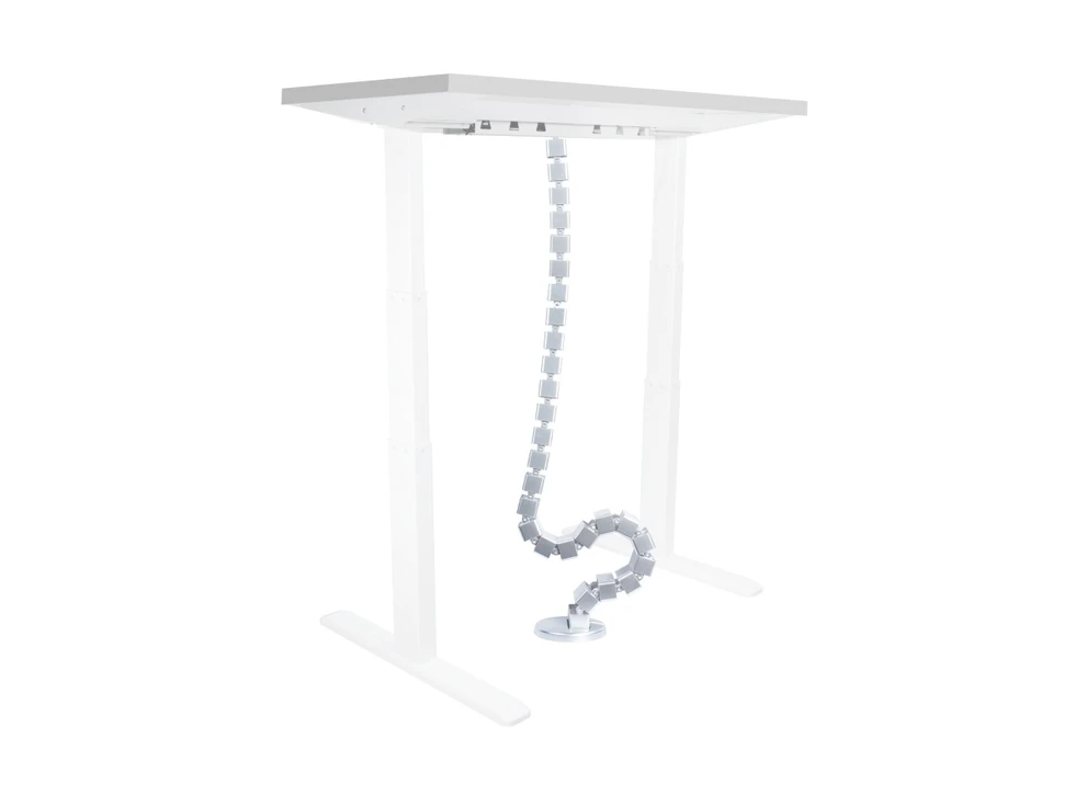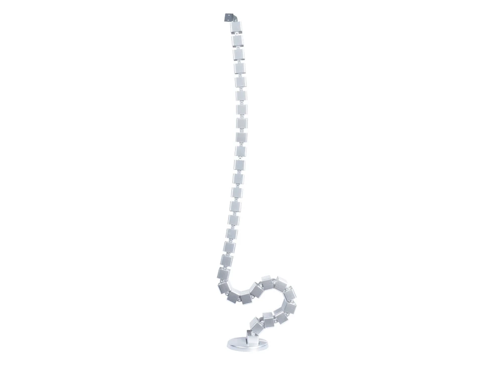 Гибкий пластиковый кабель-канал для стола. Кабельная цепь из 30 блоков. Полуоткрытый. Длина: 1300 мм. Ширина: 67 мм. Монтаж: под стол. Материал: АБС-пластик, основание металлическое. Цвет серебристый.