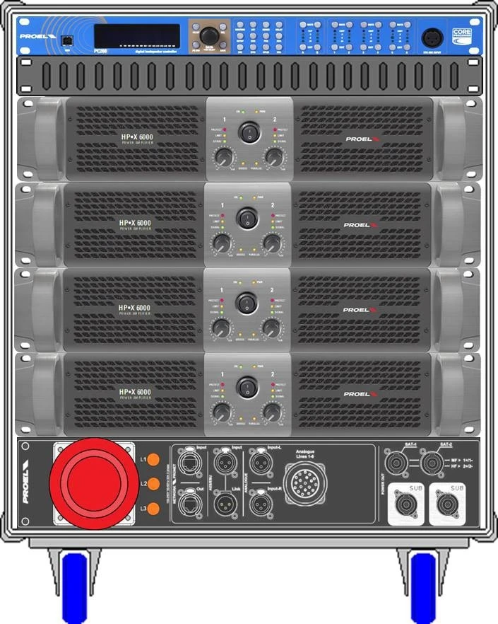Главный рэковый шкаф 9U с усилителями 4 x HPX6000, процессором и панелью MDISTRO03.
