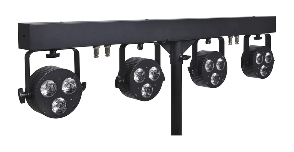 Готовый комплект из 4 прожекторов 3 x 6 Вт RGBW LED с педалью, стойкой 2200 мм и сумкой для переноски.