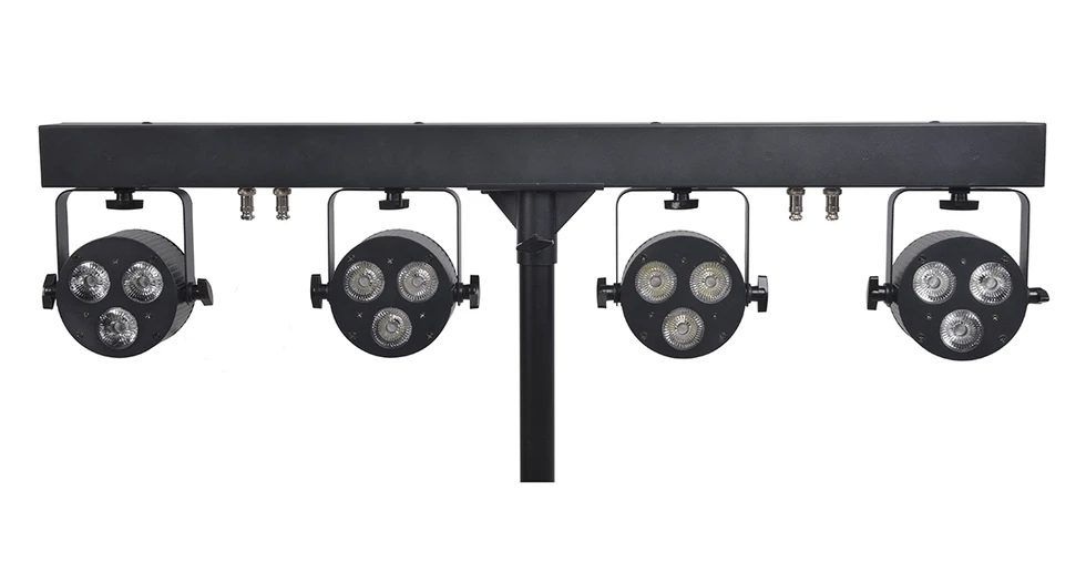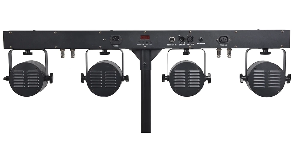 Готовый комплект из 4 прожекторов 3 x 6 Вт RGBW LED с педалью, стойкой 2200 мм и сумкой для переноски. 4/6/10/16/18 DMX-каналов.