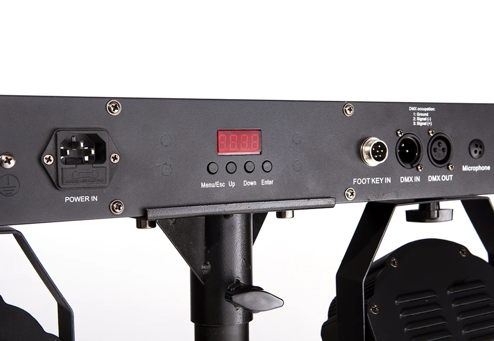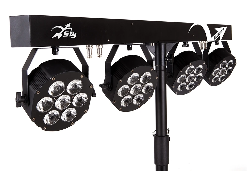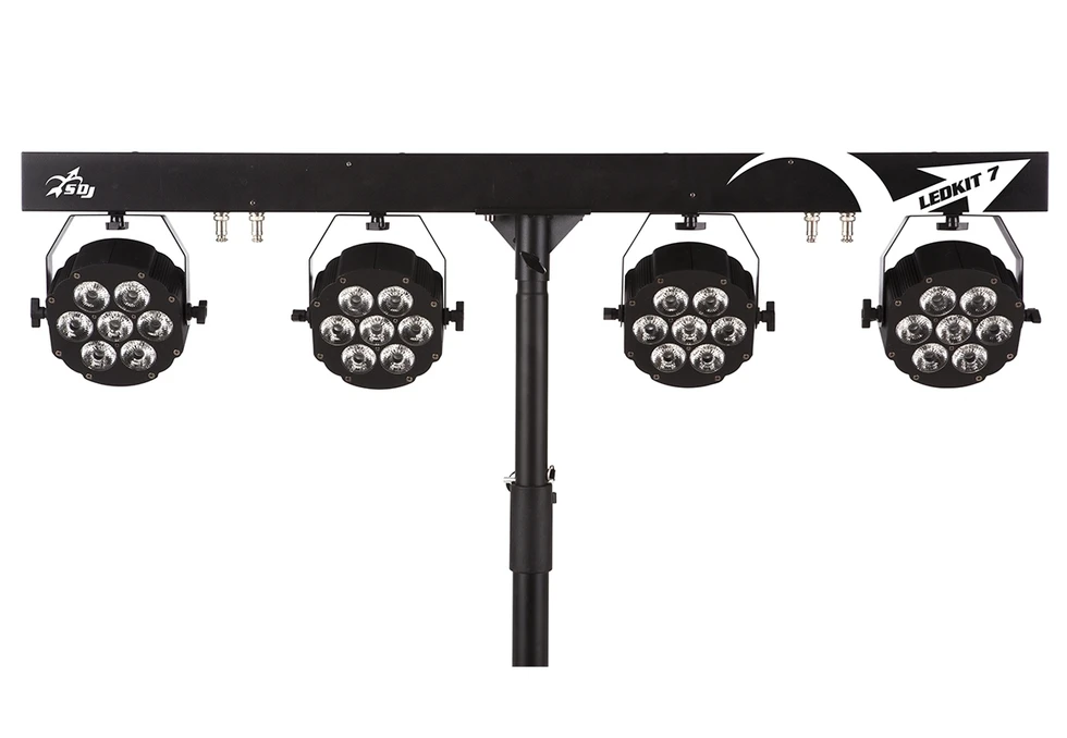 Готовый комплект из 4 прожекторов 7 x 10 Вт RGBW LED с педалью, стойкой 2800 мм и сумкой для переноски. 4/6/10/16/18 DMX-каналов.