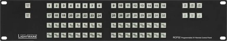 Lightware MX ? RCP32 - это панель дистанционного управления для удаленного управления матричными маршрутизаторами Lightware через подключение по локальной сети. RCP могут использоваться точно так же, как кнопки на передней панели матричных маршрутизаторов, для внесения изменений в порты, или могут быть запрограммированы для специальных функций, таких как залповый режим или управление универсальным устройством.