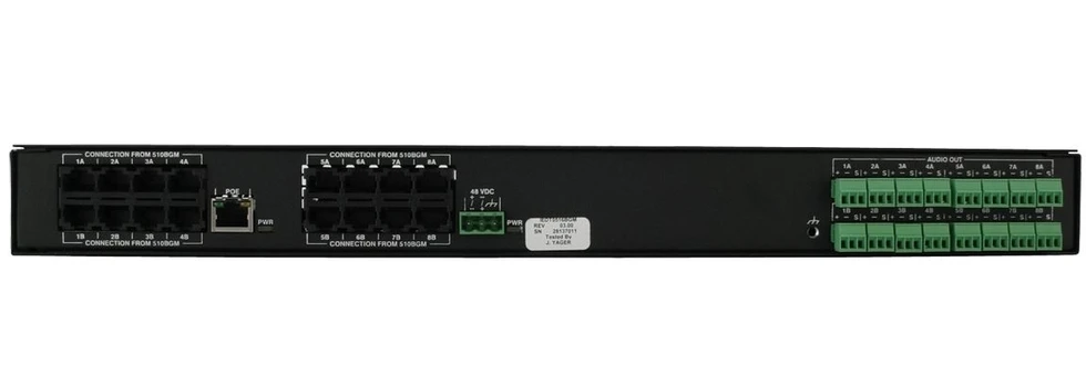 Коммутатор 16х16 источников фоновой музыки для системы GLOBALCOM, 16 входных сигналов от удаленных до 1525 м модулей 510BGM с интерфейсом RJ45, 16 выходных балансных сигналов.